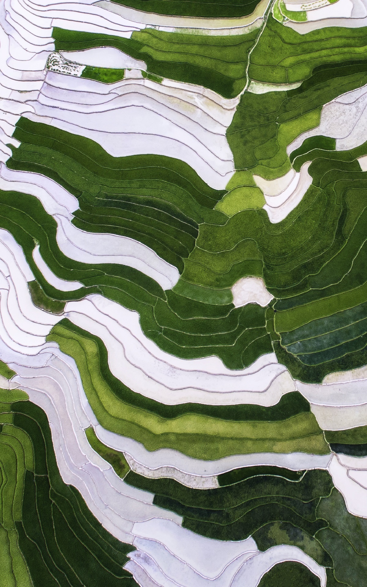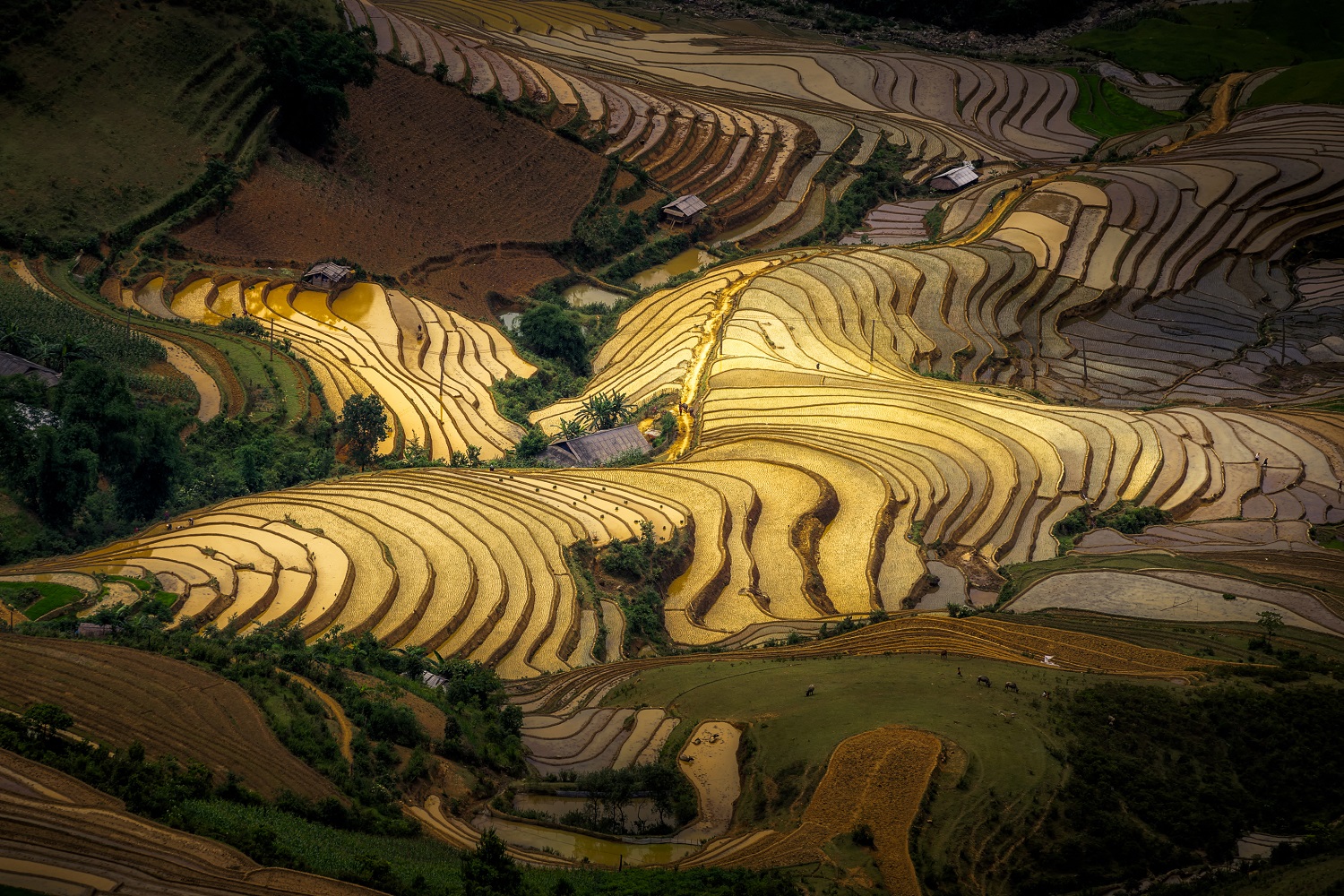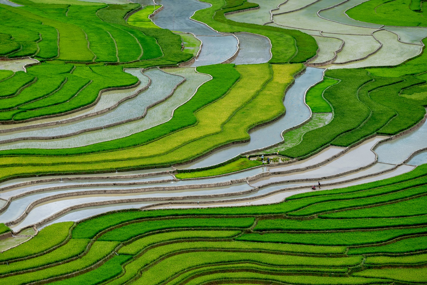 Những thửa ruộng mới cấy xanh rì, đan xen cùng luống đất nâu lóng lánh nước. Ruộng bậc thang là sự kết hợp hoàn hảo giữa vẻ hùng vĩ của núi rừng cùng vẻ đẹp của lao động sáng tạo, trải qua bao đời, bao thế hệ. Theo tác giả, điều đáng quý ở đây là lao động khai thác nhưng không hủy hoại môi trường mà còn bảo vệ và tôn tạo thiên nhiên. Lao động giúp thiên nhiên đẹp hơn và nuôi sống con người bằng lúa gạo.