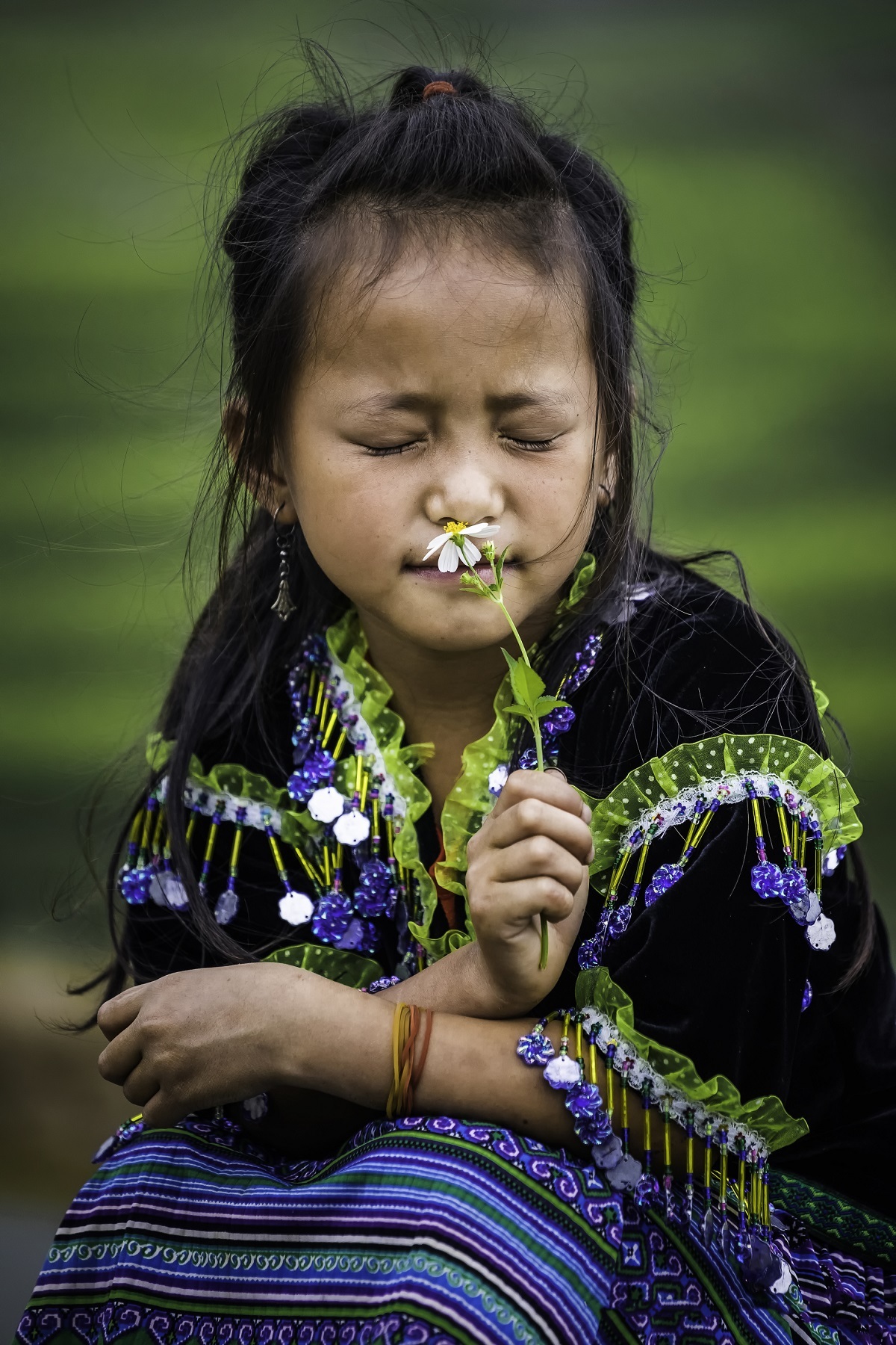 Cô bé H'Mông tạo dáng bên hoa xuyến chi. Những đứa trẻ ở đây thường được theo cha mẹ ra đồng, ngay cả trong những ngày nắng nóng.