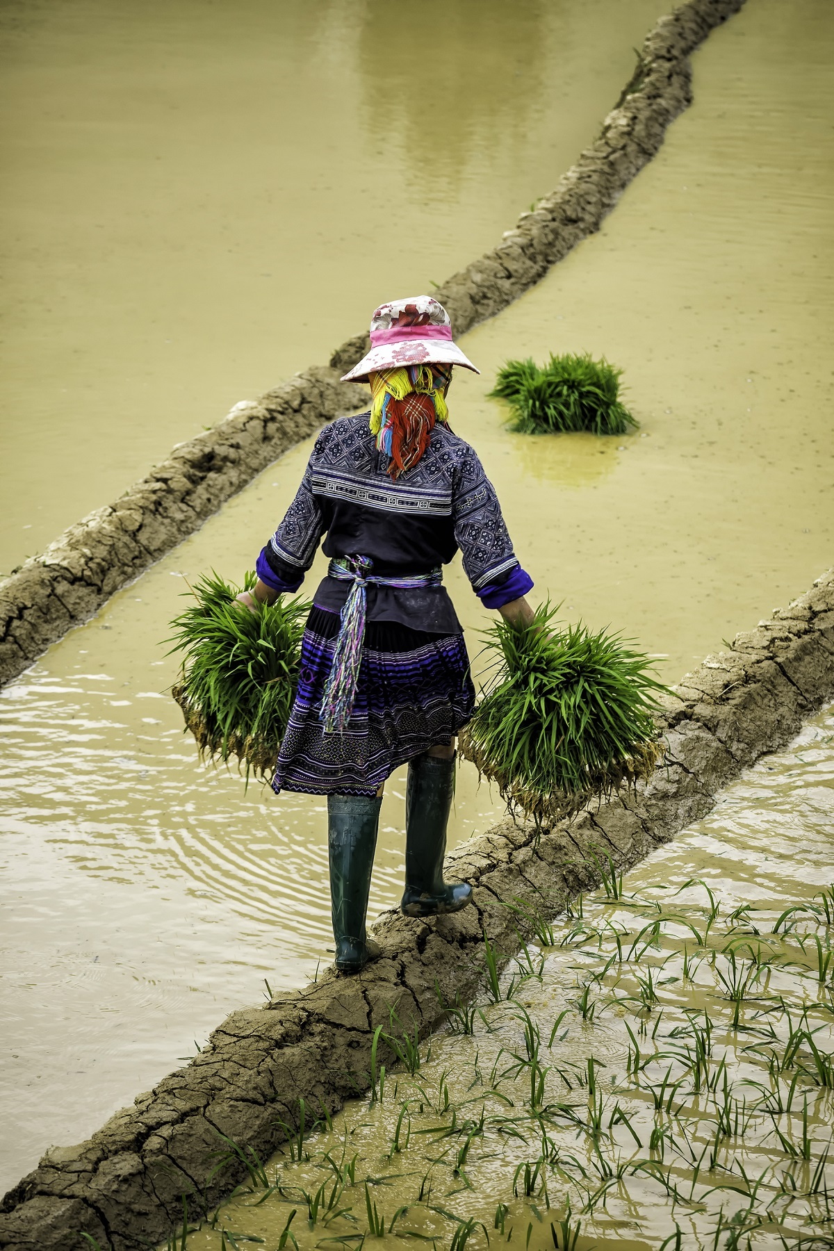 Cô gái H'Mông trong trang phục truyền thống, tay cầm mạ non, men theo những bờ đất vào ruộng cấy.