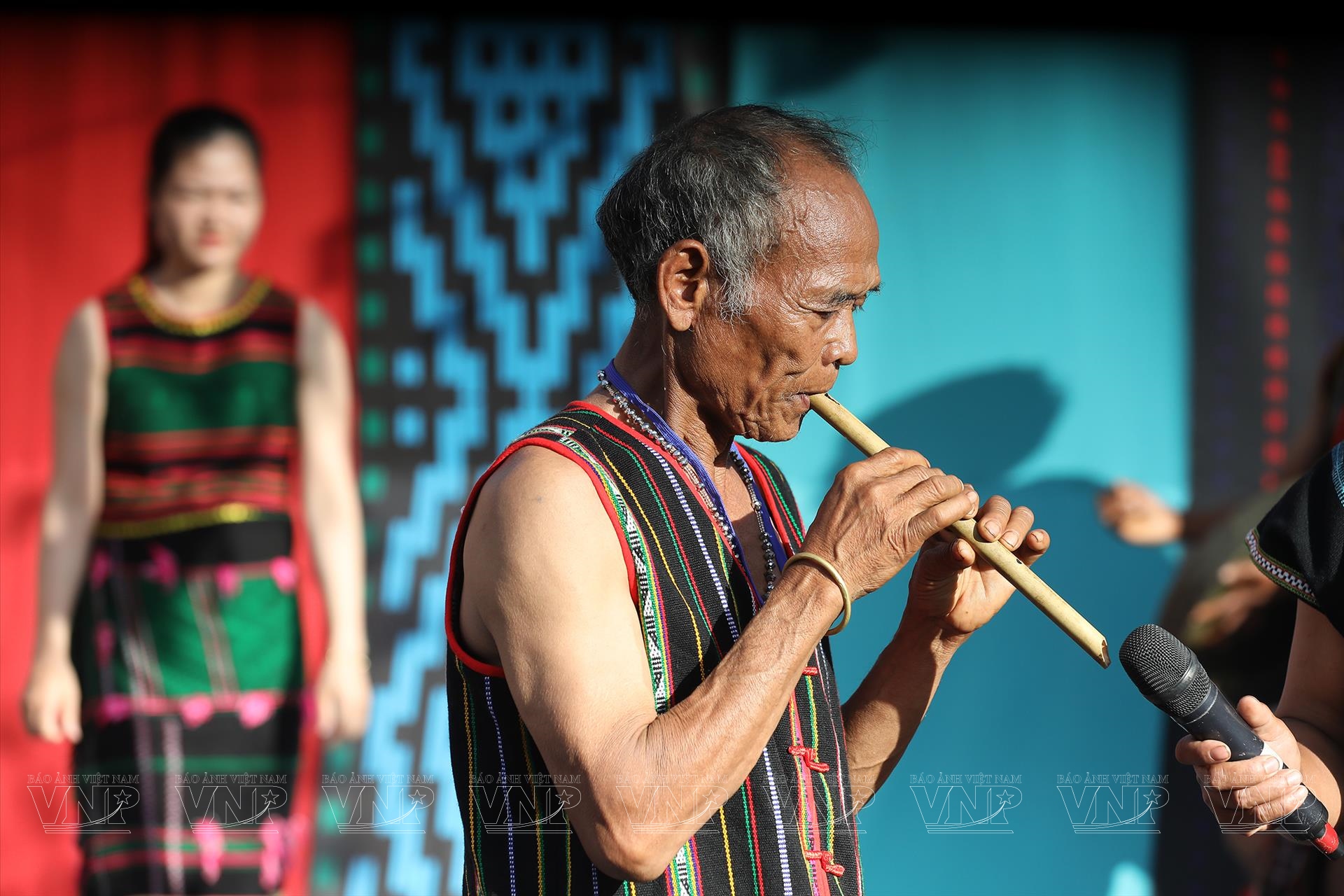 Đồng bào M'nông mặc trang phục truyền thống trong Lễ cúng sức khỏe.