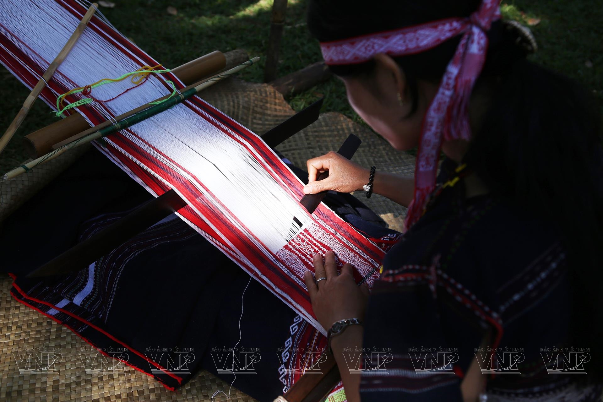 Để có những tấm vải thổ cẩm đẹp với những đường nét, hoa văn độc đáo là cả một quá trình lao động khá công phu và mệt nhọc từ trồng bông, cán bông, kéo sợi, nhuộm màu và dệt. Và những sợi vải thổ cẩm đang trong quá trình hoàn thiện.