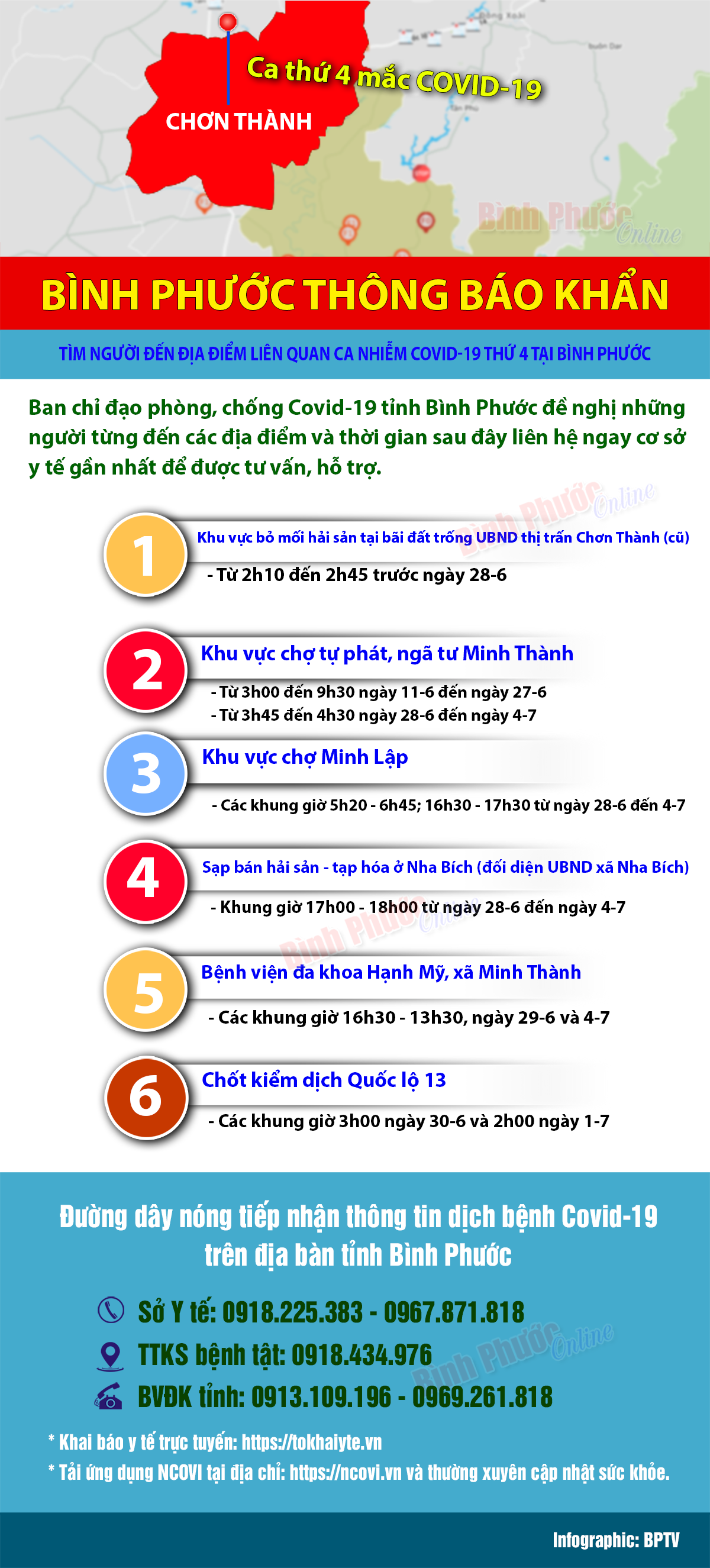 Thông báo khẩn tìm người đến những địa điểm liên quan ca nhiễm Covid-19 thứ 4 tại Bình Phước