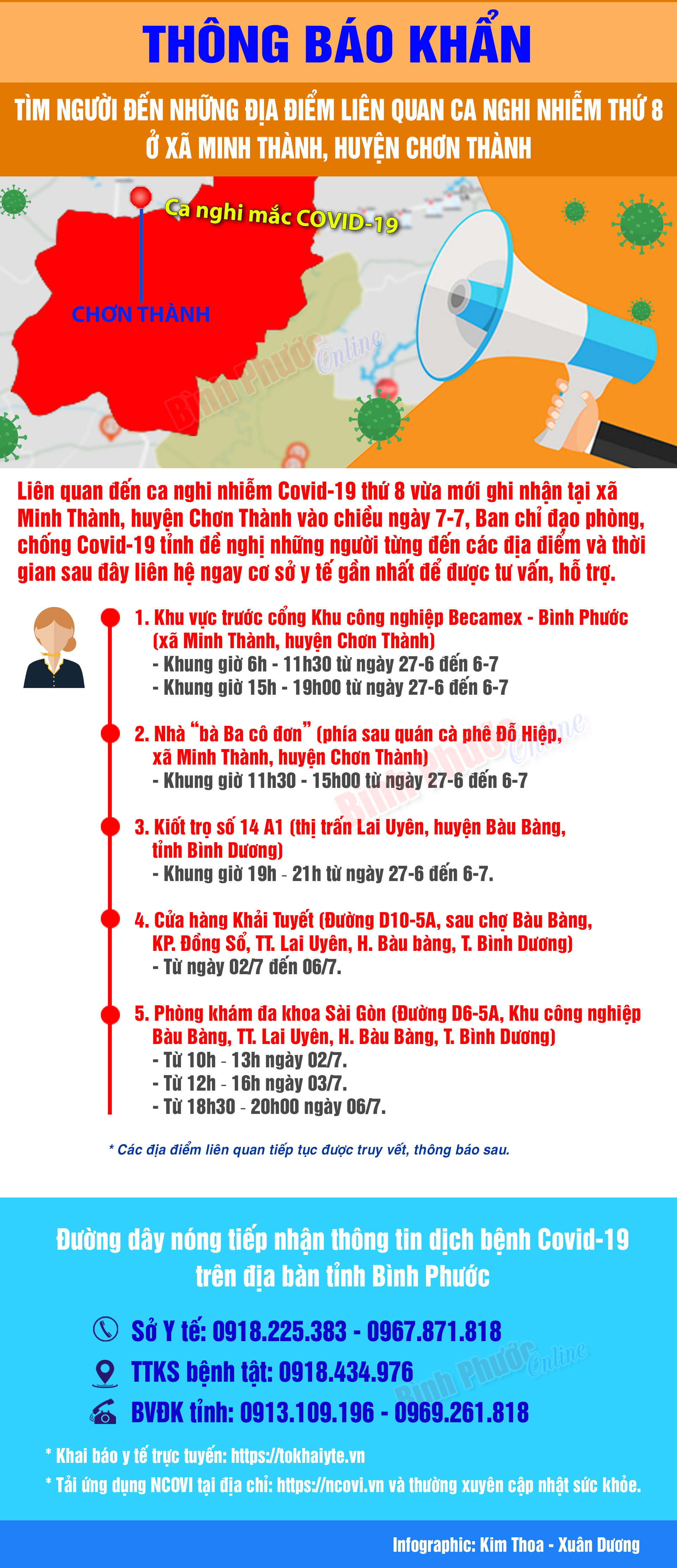 THÔNG BÁO KHẨN: Tìm người đến những địa điểm liên quan ca nghi nhiễm thứ 8 ở xã Minh Thành, huyện Chơn Thành