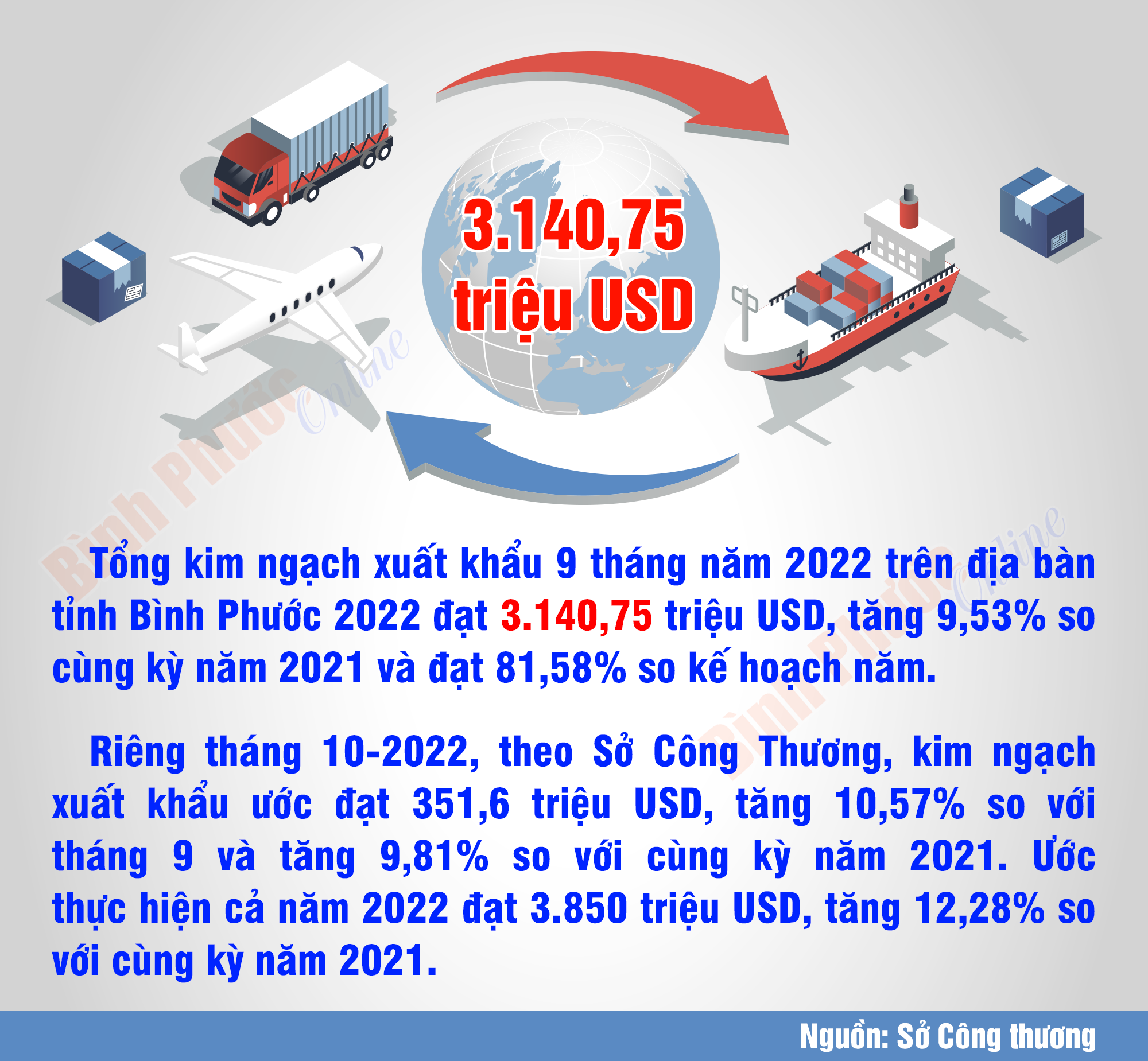 Bình Phước: 9 tháng 2022, tổng kim ngạch xuất khẩu đạt hơn 3.000 triệu USD