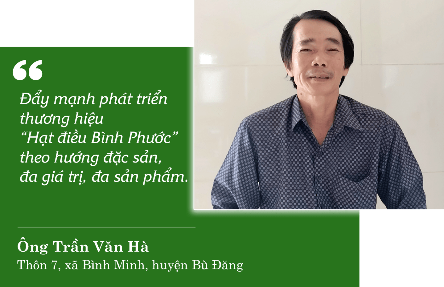 Ngoài ra, ông Hà cũng kiến nghị Nhà nước đẩy mạnh phát triển thương hiệu “Hạt điều Bình Phước” theo hướng đặc sản, đa giá trị, đa sản phẩm; ưu tiên xuất khẩu, tiêu dùng trong nước; tránh việc gian lận thương mại trong ngành điều. Bên cạnh đó tạo điều kiện để người nông dân thực sự tham gia vào liên kết chuỗi giá trị từ khâu trồng trọt, chăm sóc, thu mua và chế biến, xuất khẩu; thúc đẩy phát triển cơ giới hóa và ưu tiên đầu tư công nghệ chế biến, bảo quản sau thu hoạch; đẩy mạnh xây dựng nhãn hiệu hàng hóa, truy xuất nguồn gốc, chú trọng mã số vùng trồng, từ đó nâng cao doanh thu và gia tăng lợi nhuận.