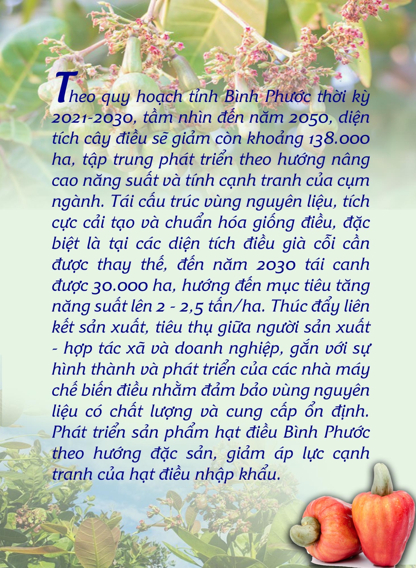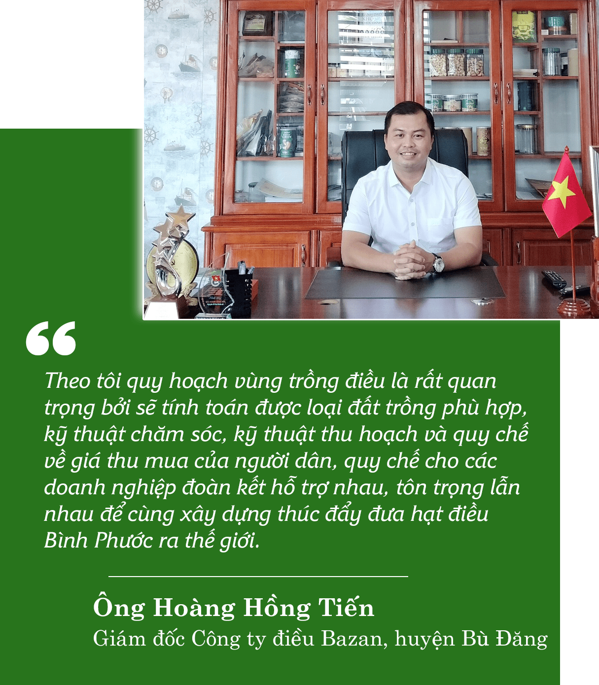Ông Hoàng Hồng Tiến, Giám đốc Công ty điều Bazan, huyện Bù Đăng nhận định: Theo quy hoạch, diện tích trồng điều ở Bình Phước đang được dần thu hẹp, thay vào đó người nông dân đang tiếp cận giống mới cho năng suất cao, sản lượng tốt đưa vào canh tác.