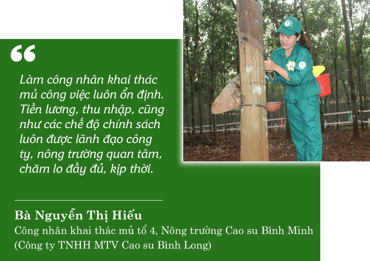 Bà Nguyễn Thị Hiếu, công nhân khai thác mủ tổ 4, Nông trường Cao su Bình Minh (Công ty TNHH MTV Cao su Bình Long) cho biết: “Bản thân tôi xác định làm công nhân khai thác mủ cho doanh nghiệp nhà nước thì công việc luôn ổn định. Đặc thù công việc phù hợp, gần nhà; hàng ngày sau khi hoàn thành giao nộp mủ cho đơn vị là có thể về lo cho gia đình, tăng gia sản xuất, phát triển kinh tế gia đình. Điều mà bản thân cảm nhận là các chế độ tiền lương, thu nhập, cũng như các chế độ chính sách luôn được lãnh đạo công ty, nông trường quan tâm, chăm lo đầy đủ, kịp thời.