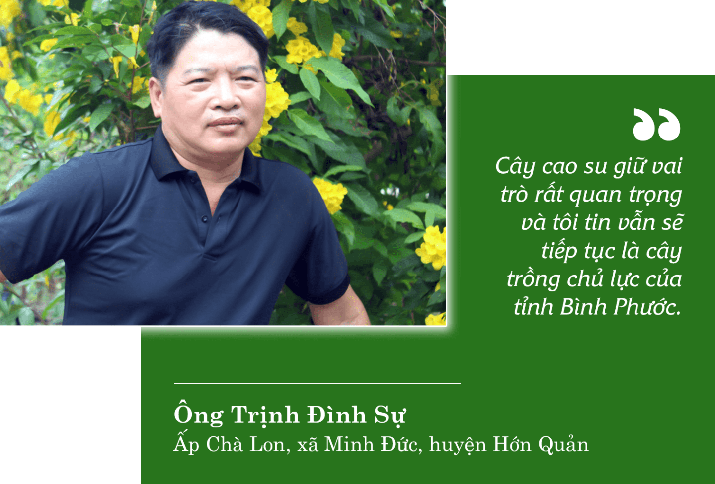 Ông Trịnh Đình Sự, ấp Chà Lon, xã Minh Đức, huyện Hớn Quản có 15 ha cao su khoảng 15 năm tuổi, thu nhập mỗi tháng từ cây cao su 150 triệu đồng sau khi đã trừ chi phí. Ông Sự khẳng định: “Cây cao su giữ vai trò rất quan trọng và tôi tin vẫn sẽ tiếp tục là cây trồng chủ lực của tỉnh Bình Phước. Các yếu tố để cao su là cây trồng chủ lực đó là dễ chăm sóc và cho thu nhập ổn định. Mặc dù giá có xuống thấp như những năm gần đây, song vẫn đảm bảo đời sống người trồng cao su. Tôi mong muốn nhà nước có giải pháp giữ mức giá ổn định như hiện nay hoặc cao hơn thì rất tốt”.