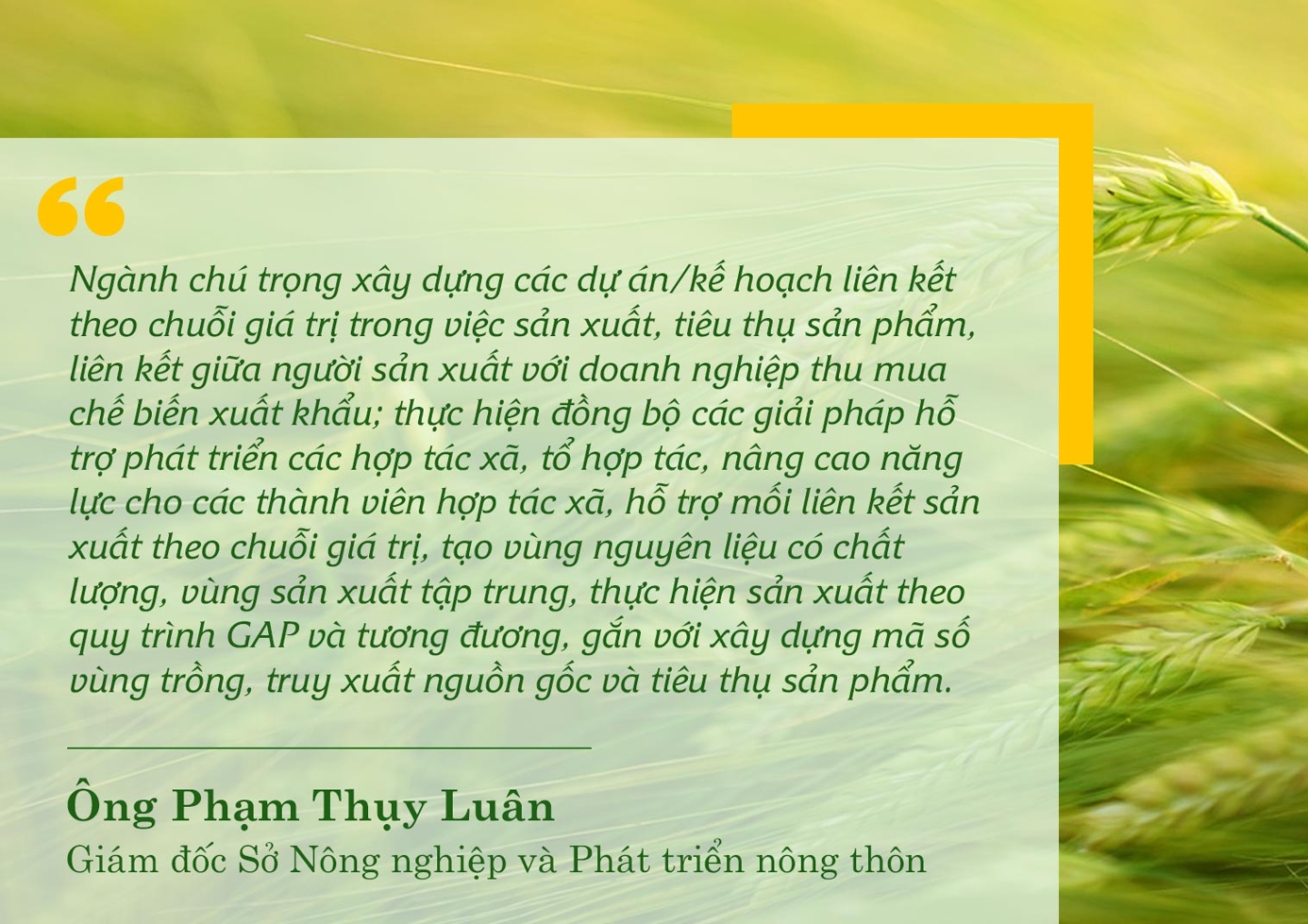 Thứ hai: Phát triển nông nghiệp theo hướng chuỗi giá trị sản xuất; gắn kết chặt chẽ sản xuất với bảo quản, chế biến, xây dựng thương hiệu, tiêu thụ. Tổ chức lại sản xuất theo hướng khuyến khích doanh nghiệp đầu tư liên kết với hợp tác xã và nông dân theo chuỗi khép kín từ sản xuất đến chế biến tiêu thụ sản phẩm. Phát triển thị trường nông sản. Khuyến khích doanh nghiệp có chuỗi sản xuất hàng hóa lớn tham gia vào quá trình sản xuất, xây dựng vùng nguyên liệu, thu mua, chế biến, tiêu thụ sản phẩm nông nghiệp. Lấy doanh nghiệp làm hạt nhân, liên kết với các thành phần trong chuỗi giá trị, liên kết tiêu thụ sản phẩm. Đẩy mạnh xây dựng thương hiệu, chỉ dẫn địa lý, đăng ký quyền bảo hộ và sở hữu trí tuệ các sản phẩm nông nghiệp.