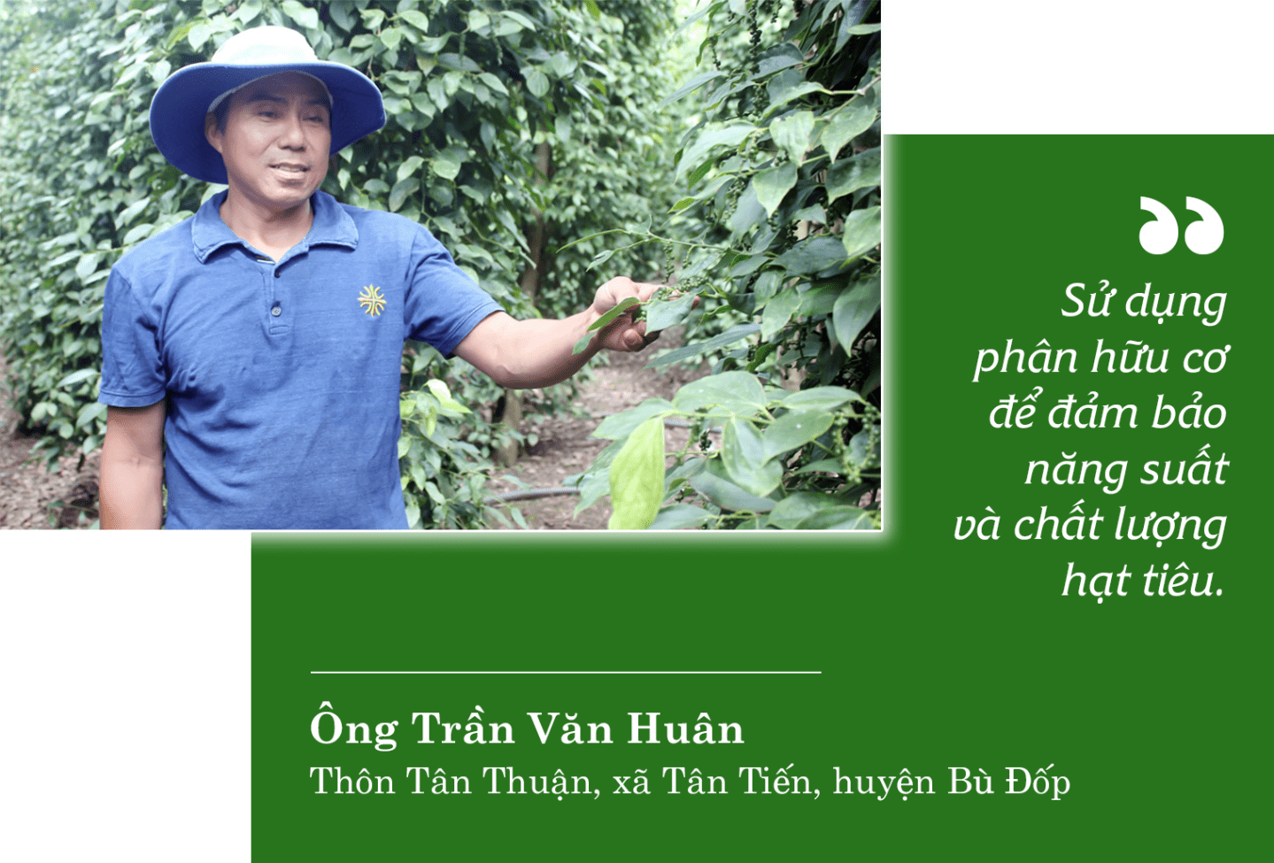 Bắt đầu trồng tiêu từ năm 2012 - thời điểm hoàng kim của cây tiêu, đến nay mặc dù giá tiêu không giữ được mức cao, nhưng với sự kiên trì quyết tâm giữ vườn, ông Trần Văn Huân, thôn Tân Thuận, xã Tân Tiến, huyện Bù Đốp đã thay đổi tư duy canh tác từ sử dụng thuốc bảo vệ thực vật hóa học sang sử dụng các sản phẩm hữu cơ, từ đó tiến tới đạt tiêu chuẩn GAP như quy hoạch ngành hàng hồ tiêu yêu cầu.
