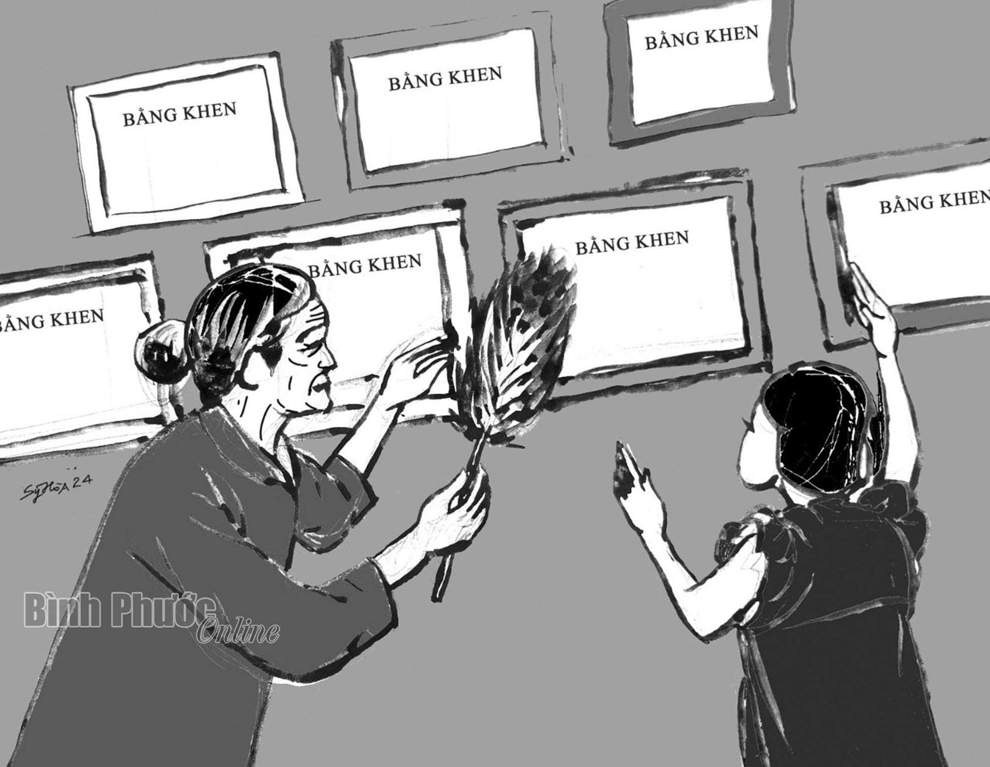 “Kỷ lục” bằng khen, giấy khen là ba. Ba có Huân chương Kháng chiến chống Mỹ. Ba là kỹ sư cơ khí, đã nhiều năm là chiến sĩ thi đua ngành công nghiệp, nhiều năm là kiện tướng sáng kiến. Có cả bằng khen của Chính phủ Lào vì có thời gian ba sang đó làm chuyên gia. Má cũng chẳng kém, vì má có đến chục cái bằng khen. Má là cô giáo dạy giỏi, là phụ nữ gương mẫu; lại có lần đoạt giải nữ công gia chánh và giải nhất môn cầu lông. Con cháu trong nhà thì kể từ khi anh Hiệp học lớp 10, em Khuê học lớp 7 cũng có 7, 8 cái bằng khen, giấy khen học sinh giỏi, kiện tướng cờ vua, giải nhất kỳ thi Toán toàn huyện. Nhỏ nhất nhà là bé Mi. Bé Mi 5 tuổi đang học mẫu giáo, ngoài phiếu bé ngoan còn có đến 5, 6 cái giấy khen. Khách đến chơi, ai cũng ngắm nghía từng chiếc giấy khen, bằng khen với vẻ ngưỡng mộ không che giấu. Ba mảng tường trong phòng khách là niềm tự hào của cả gia đình; cũng là nơi nội hằng ngày lau chùi, tu sửa cho ngay ngắn, sạch sẽ.
