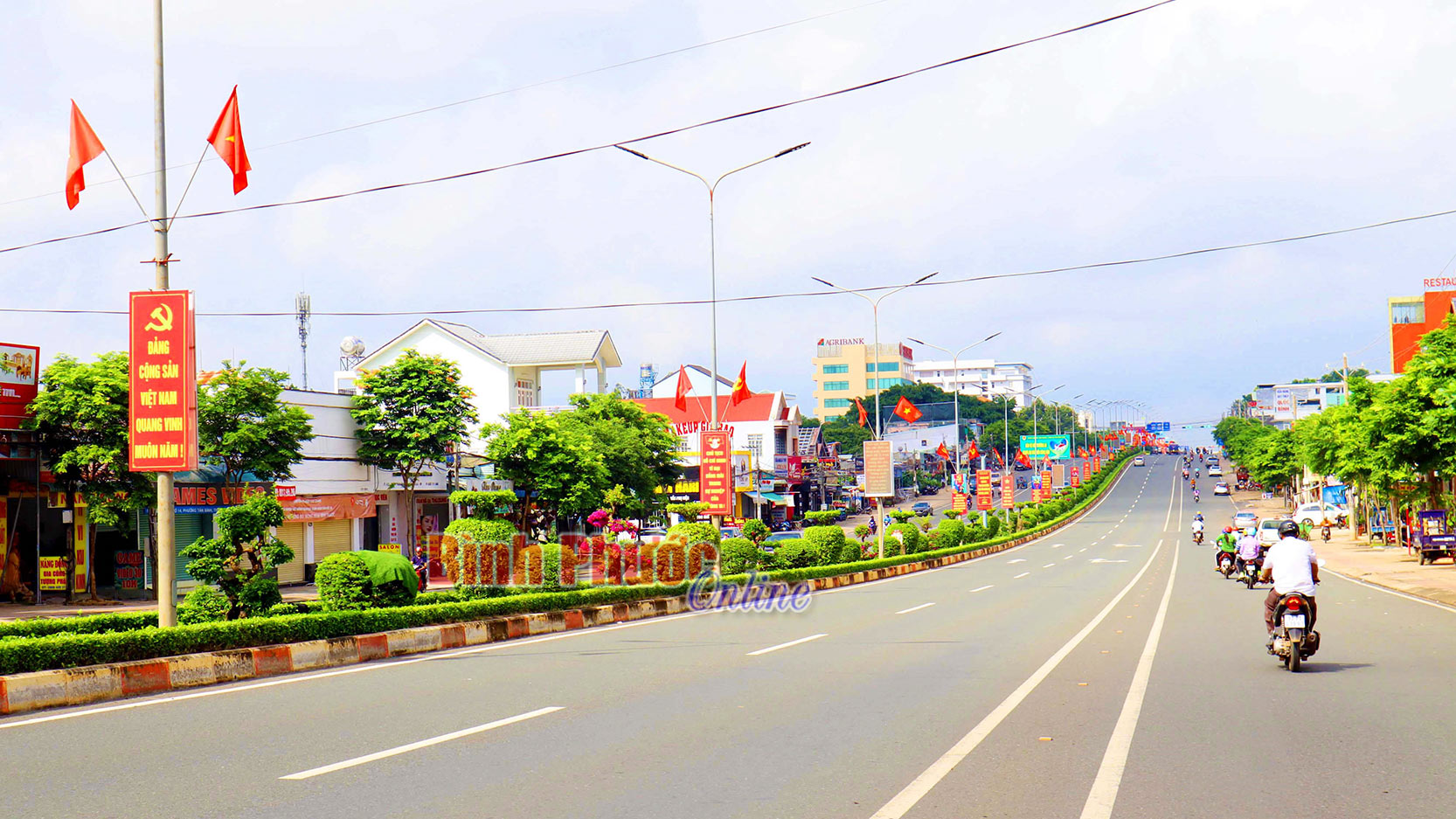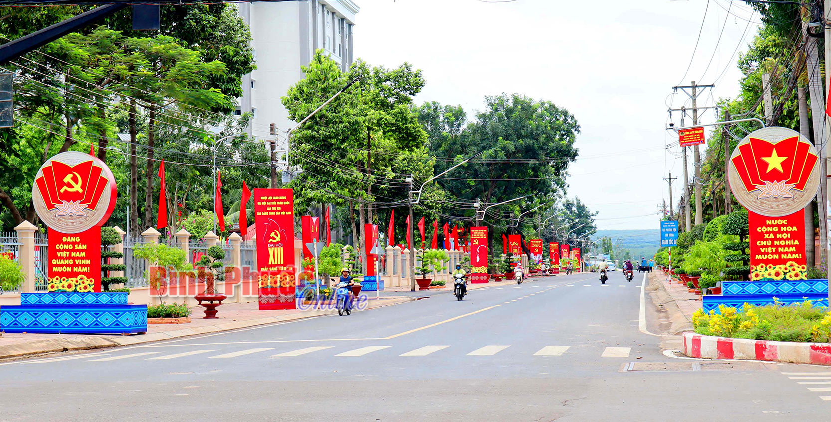 Quốc lộ 14, đoạn qua nội ô thành phố Đồng Xoài được trang trí cờ, pano chào mừng Đại hội Đảng bộ tỉnh lần thứ XI