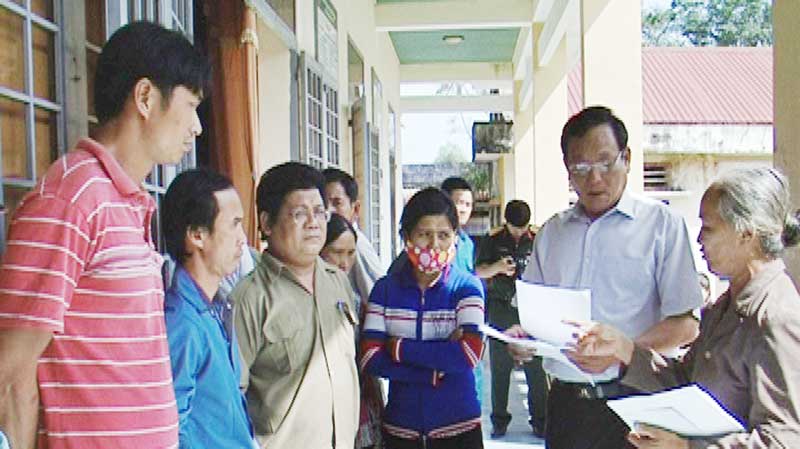 Chủ tịch UBND huyện Bù Đăng (thứ hai từ phải sang) xem xét đơn của các hộ dân xã Đăng Hà