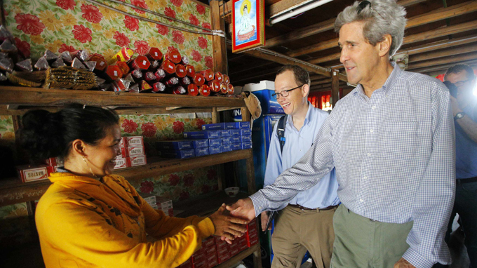 Ngoại trưởng John Kerry vào thăm một cửa hiệu tạp hóa ở Cà Mau ngày 15-12