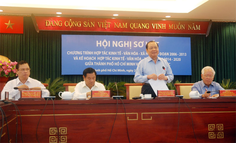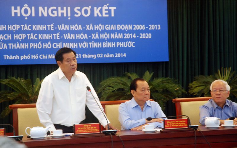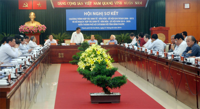 Sau 8 năm thực hiện chương trình hợp tác (2006-2013) kinh tế - văn hóa và xã hội giữa Bình Phước và thành phố Hồ Chí Minh, chiều nay 21-2-2014, tại thành phố Hồ Chí Minh đã diễn ra hội nghị sơ kết và ký kết chương trình hợp tác giai đoạn 2014-2020. Hội nghị do chủ tịch UBND thành phố Lê Hoàng Quân, chủ tịch UBND tỉnh Bình Phước Nguyễn Văn Trăm đồng chủ trì. Hội nghị vinh dự được đón tiếp Ủy viên Bộ chính trị, Bí thư Thành ủy Lê Thanh Hải, Ủy viên Trung ương Đảng, Bí thư Tỉnh ủy Nguyễn Tấn Hưng đến dự và phát biểu tại hội nghị. Dự hội nghị còn có đại diện Thường trực Tỉnh ủy, Thành ủy, HĐND, lãnh đạo các sở; các doanh nghiệp của hai địa phương.