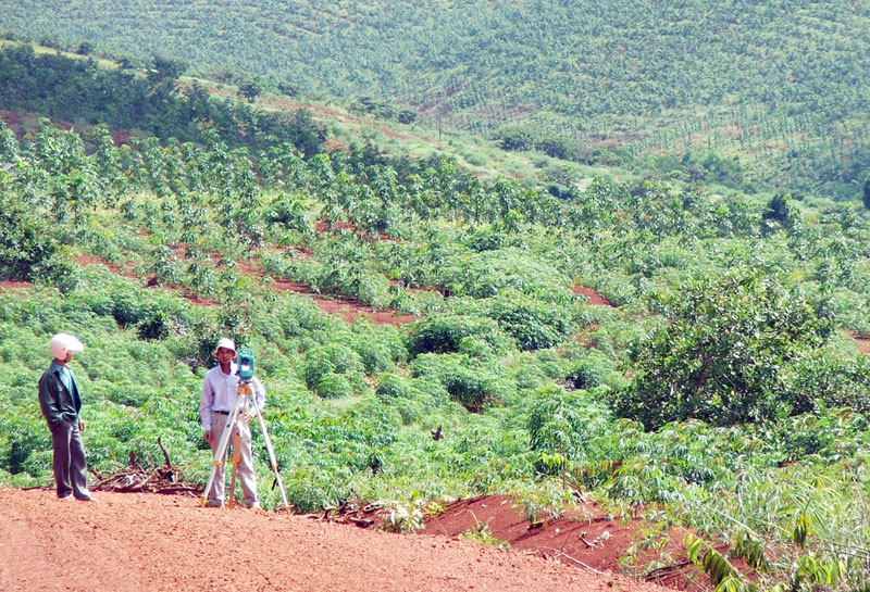 Cán bộ địa chính Đồng Phú đo đạc diện tích đất nông nghiệp trên thực địa để cấp giấy chứng nhận quyền sử dụng đất cho người dân xã Tân Hưng - Ảnh: B.T