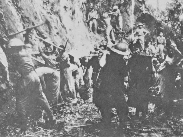 Bộ đội cùng đồng bào các dân tộc Tây Bắc xẻ núi, làm đường vào trận địa.
