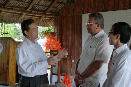 Thủ tướng trao đổi với Bộ trưởng Nông nghiệp Cuba khi thăm Dự án hợp tác phát triển sản xuất lúa gạo Việt Nam - Cuba