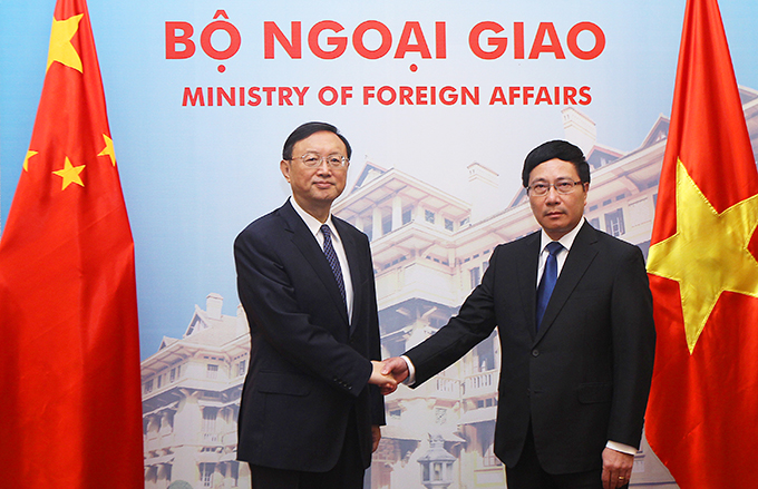 Phó thủ tướng, Bộ trưởng Bộ Ngoại giao Phạm Bình Minh (phải) và Ủy viên Quốc vụ Trung Quốc Dương Khiết Trì trong cuộc hội đàm tại Hà Nội sáng 18-6