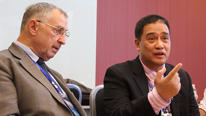 Ông Renato DeCastro và ông Daniel Schaeffer trả lời phỏng vấn của báo chí liên quan đến những tuyên bố sai trái của Trung Quốc tại biển Đông vào sáng 20-6
