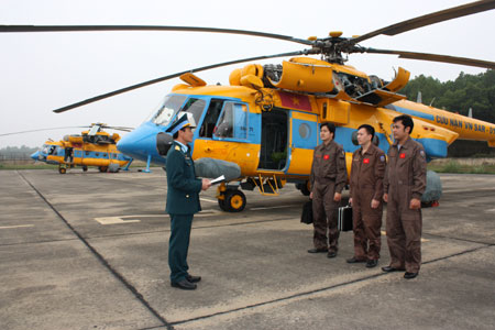 Đại tá Hoàng Lại Long (mặc quân phục thường dùng mùa đông) giao nhiệm vụ cho một tổ bay