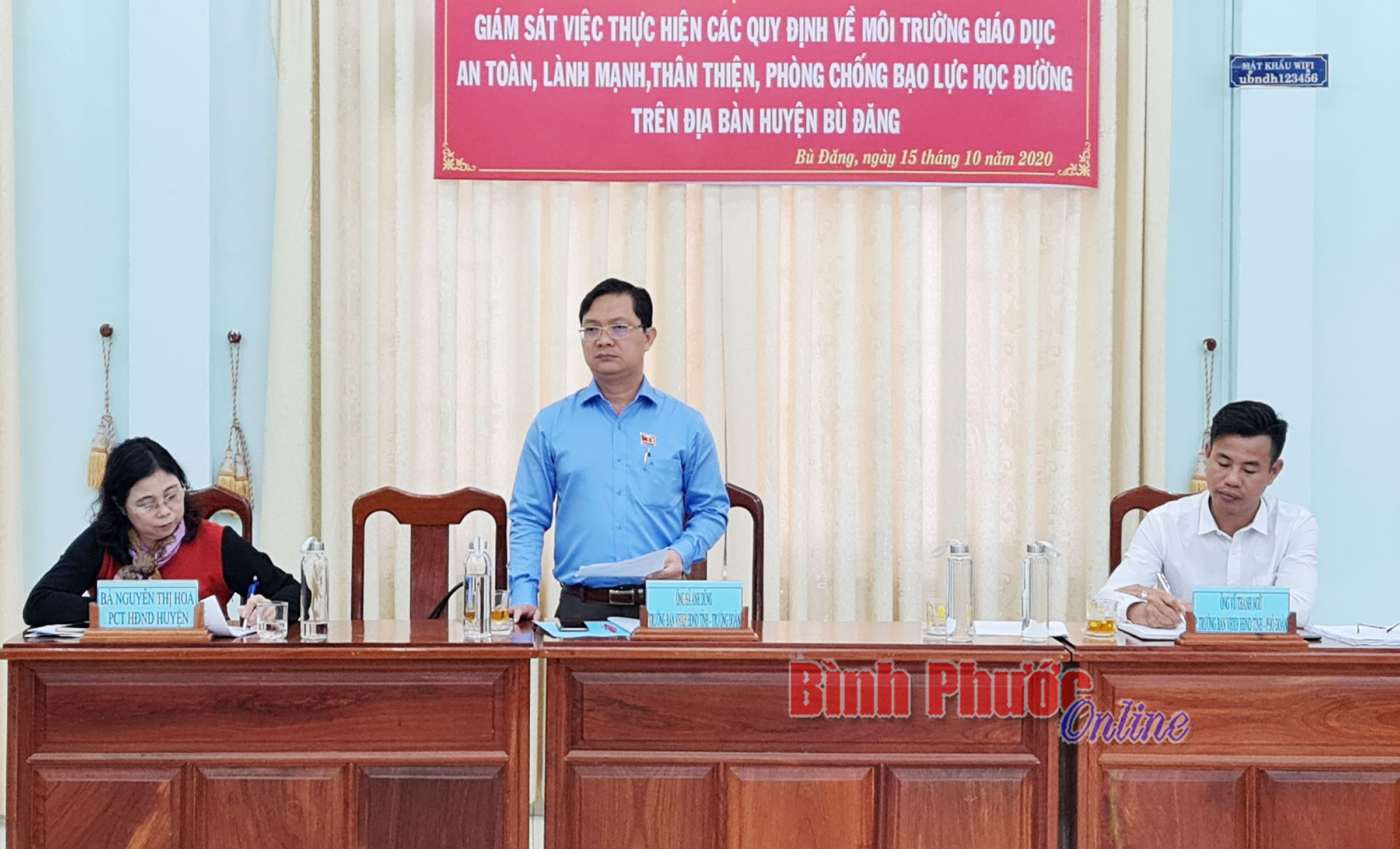 Trưởng ban Văn hóa - Xã hội HĐND tỉnh Hà Anh Dũng đề nghị, phòng Giáo dục và Đào tạo huyện Bù Đăng cần cụ thể hóa việc triển khai các nghị định, quyết định của Trung ương, của tỉnh. Đánh giá vai trò của cơ quan thường trực và các cơ quan thành viên trong phối hợp xây dựng trường học an toàn, thân thiện, phòng, chống bạo lực học đường. Đánh giá thêm sự tác động của công tác xã hội hóa trong việc xây dựng môi trường giáo dục an toàn, lành mạnh cho trẻ. Bên cạnh đó chỉ đạo các trường tăng cường tuyên truyền, nâng cao nhận thức cho giáo viên và học sinh về công tác này qua các buổi sinh hoạt ngoại khóa. Tranh thủ mạng xã hội làm kênh nắm bắt, trao đổi thông tin đa chiều, tạo niềm tin, sự đồng thuận trong phụ huynh. Chú trọng giáo dục giới tính, tâm sinh lý cho học sinh để nâng cao hiệu quả công tác phòng, ngừa.