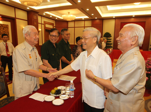 ![]() Tổng Bí thư Nguyễn Phú Trọng với các đại biểu cựu thanh niên xung phong |