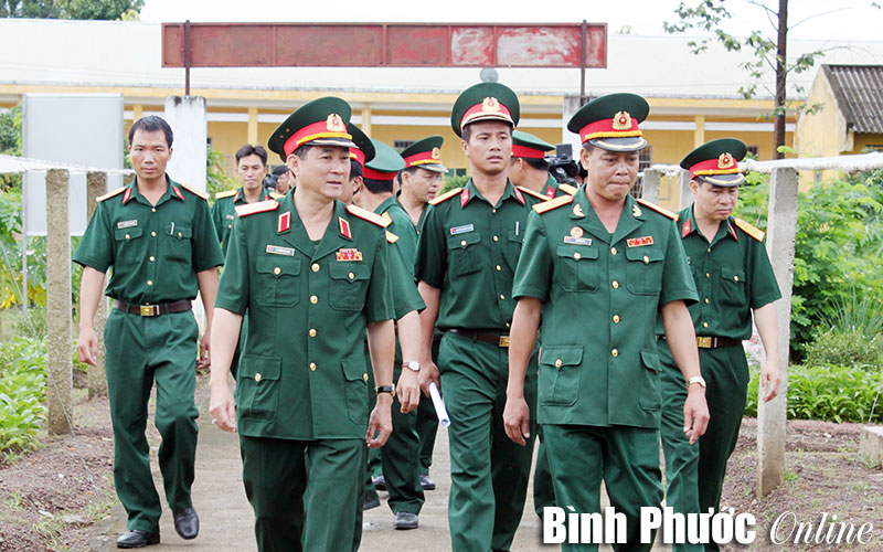 Thiếu tướng Nguyễn Gia Hòa, Chủ nhiệm chính trị Quân khu 7 (hàng đầu, bên trái) kiểm tra doanh trại Tiểu đoàn 208 trong ngày đầu tiếp nhận tân binh - Ảnh: Văn Minh
