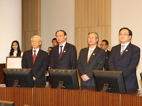 Trước đó, cũng tại Phủ Tổng thống, Tổng Bí thư Nguyễn Phú Trọng và Tổng Thống Park Geun Hye đã tiến hành hội đàm hẹp.