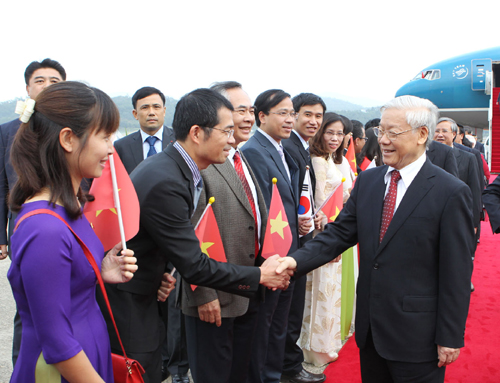 Lễ đón được tổ chức trọng thể theo nghi thức cao nhất dành cho Nguyên thủ quốc gia. Tổng thống Hàn Quốc Park Geun Hye chủ trì Lễ đón. Tổng thống Park Geun Hye đã đón chào Tổng Bí thư Nguyễn Phú Trọng và mời Tổng Bí thư cùng bước lên bục danh dự. Quân nhạc cử quốc thiều hai nước. Tổng thống Park Geun Hye mời Tổng Bí thư Nguyễn Phú Trọng duyệt đội danh dự.