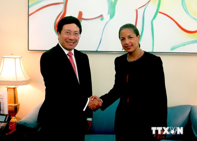 Tại cuộc gặp giữa Phó Thủ tướng, Bộ trưởng Ngoại giao Phạm Bình Minh và Cố vấn An ninh quốc gia Susan Rice, hai bên đã thảo luận về các biện pháp tăng cường quan hệ song phương và các vấn đề khu vực, quốc tế cùng quan tâm.