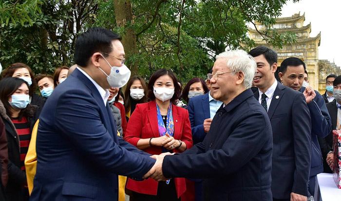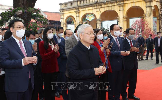 Trong không gian linh thiêng của Hoàng thành Thăng Long, trời đất giao hòa, mừng Đảng, mừng Xuân mới Tân Sửu 2021, Tổng Bí thư, Chủ tịch nước Nguyễn Phú Trọng cùng các đại biểu thành kính dâng hương tưởng nhớ đức Thái tổ triều Lý - người đã định đô ở Thăng Long vào mùa thu năm 1010. Kể từ đó, Thăng Long và đất nước bước vào thời đại mới, các triều đại kế tiếp mở mang dựng xây bờ cõi, bồi đắp lịch sử văn hiến nghìn năm, lưu truyền đến thời đại Hồ Chí Minh quang vinh.