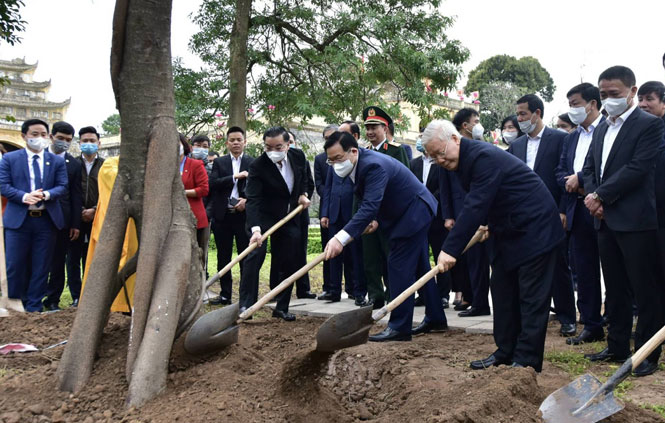 Sau lễ dâng hương, thực hiện chương trình trồng cây đầu xuân, tưởng nhớ Chủ tịch Hồ Chí Minh vĩ đại, người đã phát động Tết trồng cây cách đây 62 năm, Tổng Bí thư, Chủ tịch nước Nguyễn Phú Trọng và các đồng chí lãnh đạo Trung ương, thành phố Hà Nội đã trồng cây đa ở trước Đoan Môn.