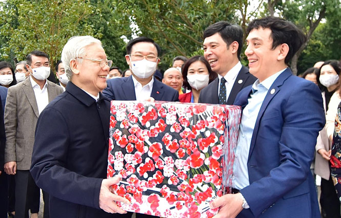 Tổng Bí thư, Chủ tịch nước Nguyễn Phú Trọng tặng quà cho cán bộ, nhân viên Khu di tích Hoàng thành Thăng Long