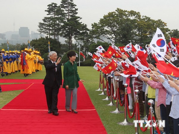 Tổng thống Hàn Quốc Park Geun-hye và Tổng Bí thư Nguyễn Phú Trọng tại Lễ đónĐây là lần đầu tiên Tổng Bí thư Đảng Cộng sản Việt Nam thăm cấp Nhà nước tới Hàn Quốc. Chuyến thăm được chờ đón từ lâu và bạn đã tổ chức đón tiếp rất trọng thị, nhiệt thành, với nghi lễ cao nhất dành cho nguyên thủ quốc gia.