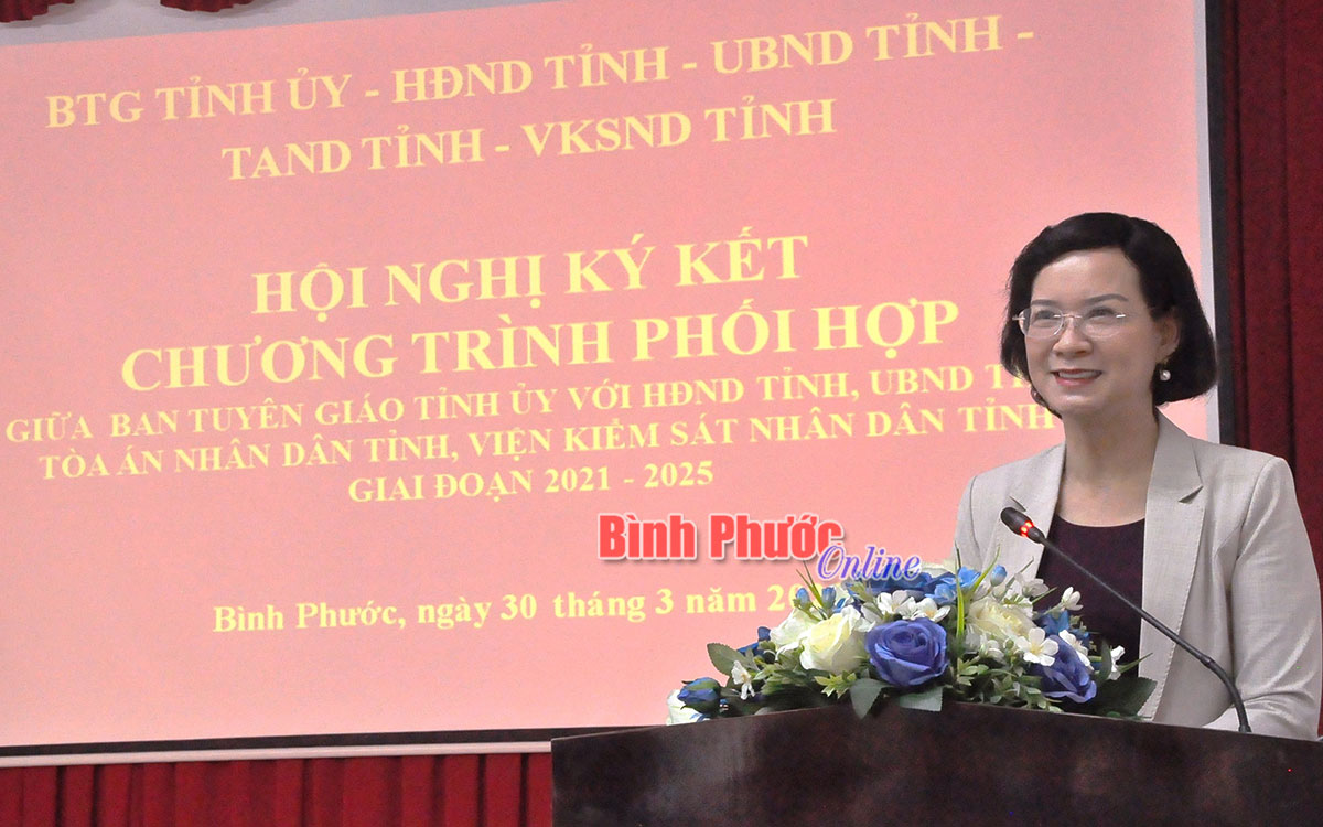 Tại hội nghị, lãnh đạo Ban Tuyên giáo, HĐND, UBND, TAND và Viện KSND tỉnh đã ký kết chương trình phối hợp trong việc thực thi pháp luật, triển khai kế hoạch phát triển kinh tế - xã hội, giải quyết các vấn đề nổi cộm, nhân dân quan tâm giai đoạn 2021-2025.