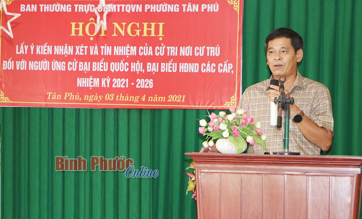 Ông Huỳnh Hữu Thiết (khu phố Phú Lộc, phường Tân Phú), đại biểu 2 cấp HĐND tỉnh và huyện Bù Đăng phát biểu thể hiện quyết tâm làm tròn trách nhiệm của người đại biểu dân cử nếu trúng cử