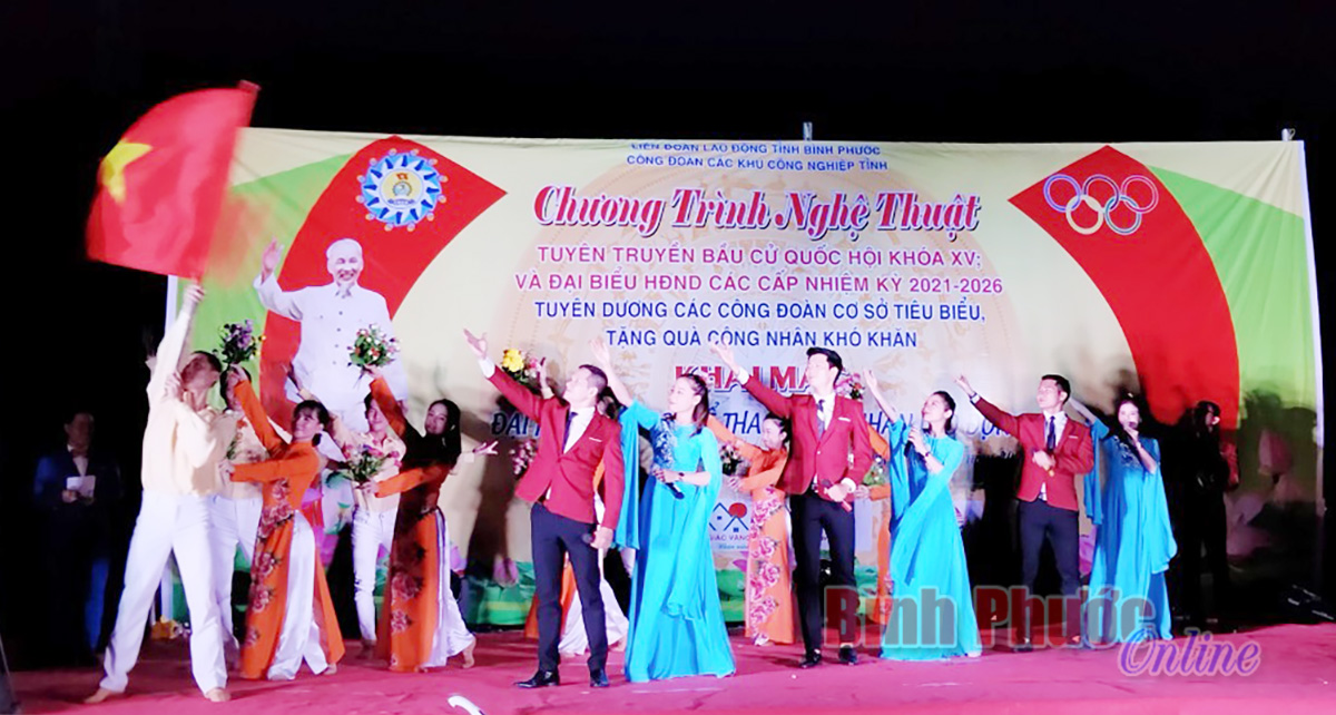 Bên cạnh đó công nhân, lao động còn được thưởng thức chương trình nghệ thuật đặc sắc tuyên truyền về cuộc bầu cử do Đoàn ca múa nhạc dân tộc tỉnh Bình Phước biểu diễn. Qua đó giúp công nhân, lao động, nâng cao nhận thức, trách nhiệm của cử tri, tạo sự đồng thuận trong xã hội để cuộc bầu cử vào ngày 23-5 tới đây thực sự là ngày hội của toàn dân.