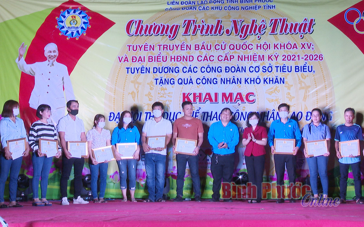 Nhân dịp này Công đoàn các khu công nghiệp tỉnh cũng tuyên dương tặng giấy khen 3 tập thể, 15 cá nhân có thành tích xuất sắc trong phong trào thi đua lao động, sản xuất giỏi năm 2021.