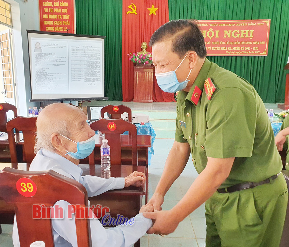 Ông Dương Văn Mạnh, Phó giám đốc Công an tỉnh Bình Phước, người ứng cử đại biểu HĐND tỉnh thăm hỏi sức khỏe cử tri xã Thuận Lợi, huyện Đồng Phú