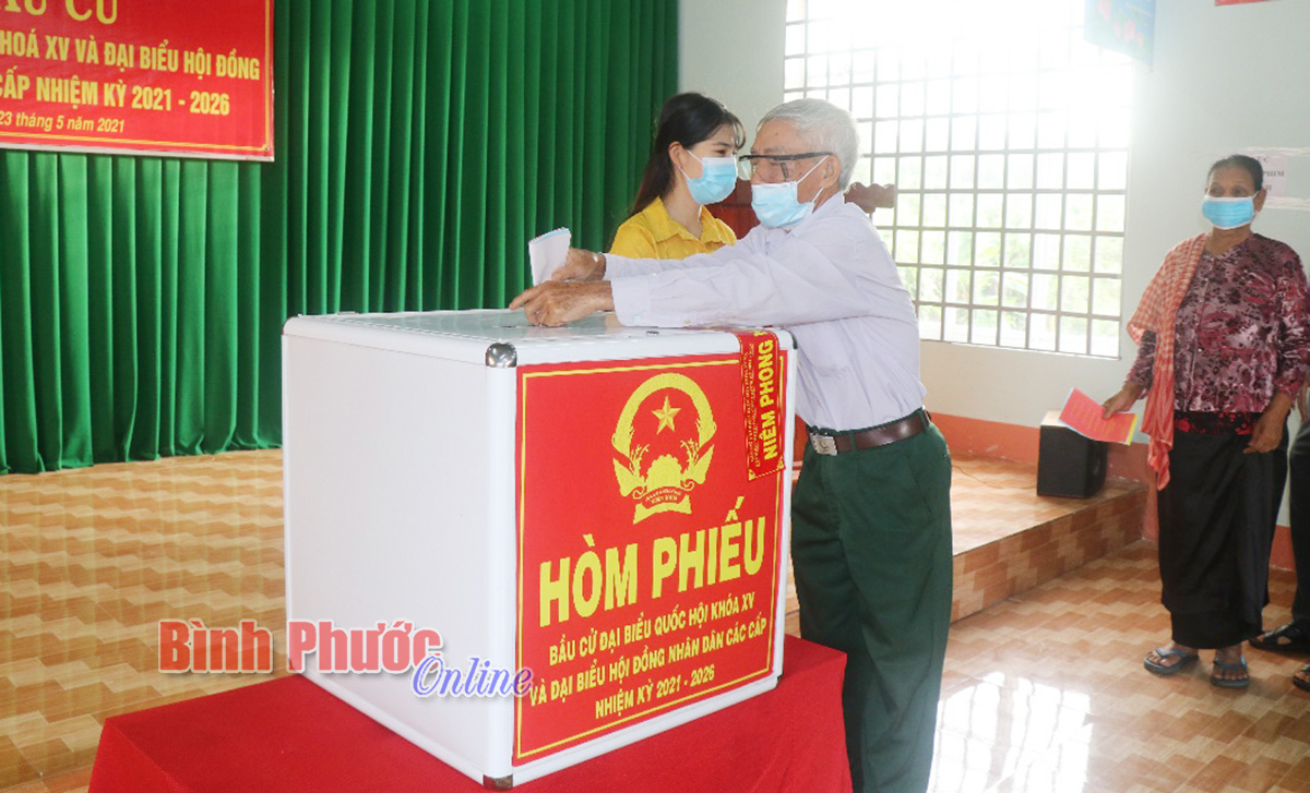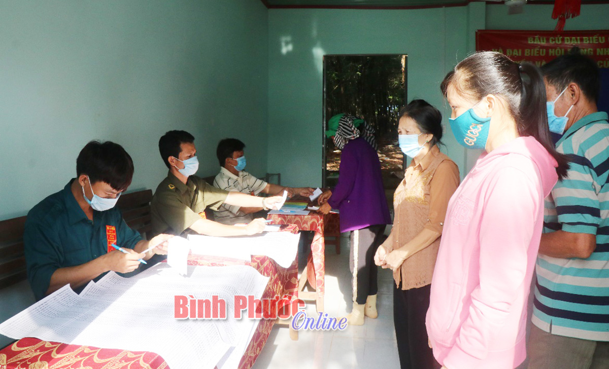 Dù người dân đến bầu cử đông đúc nhưng đơn vị bầu cử số tại ấp Bù Tam vẫn đảm bảo các công tác phòng dịch: đeo khẩu trang, kháng khuẩn, kiểm tra thân nhiệt và giãn cách đúng quy định.