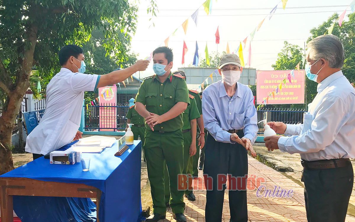 Chung tay phòng chống dịch Covid-19, cử tri Lộc Ninh đo thân nhiệt, rửa tay sát khuẩn trước khi bầu cử