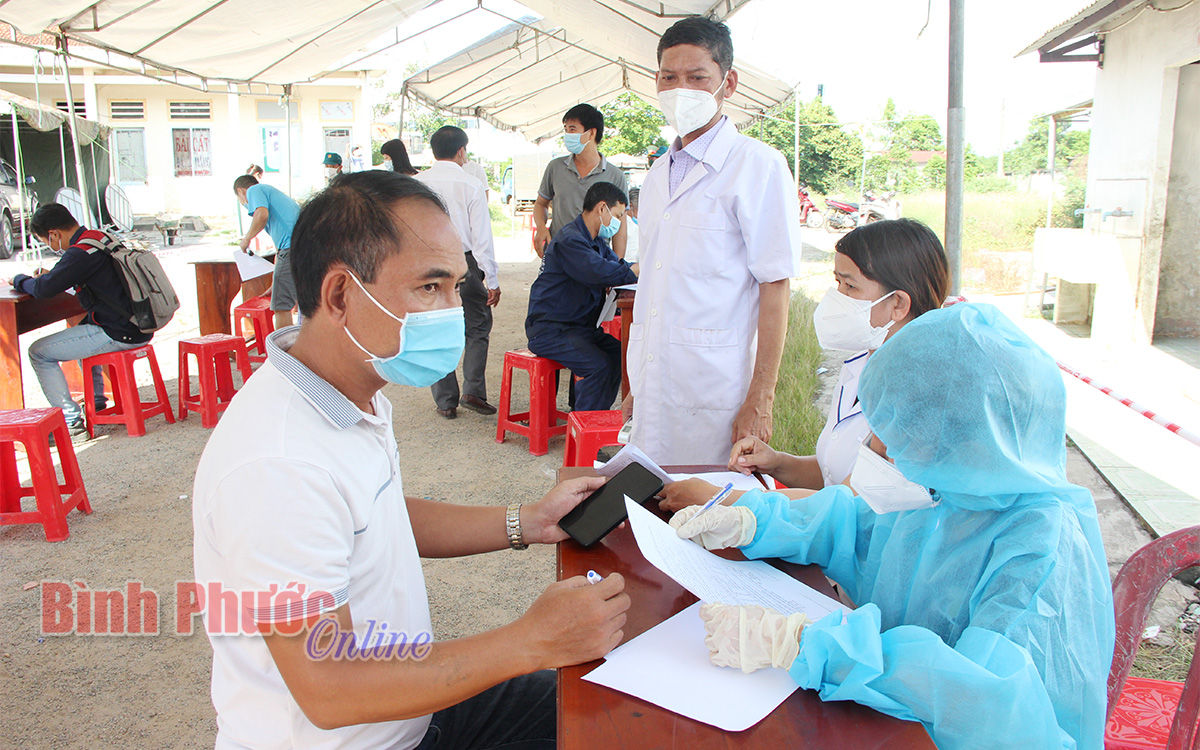 Cán bộ nhân viên y tế trực chốt lấy mẫu xét nghiệm và khai báo y tế đối với tất cả những người từ các tỉnh, thành về Bình Phước