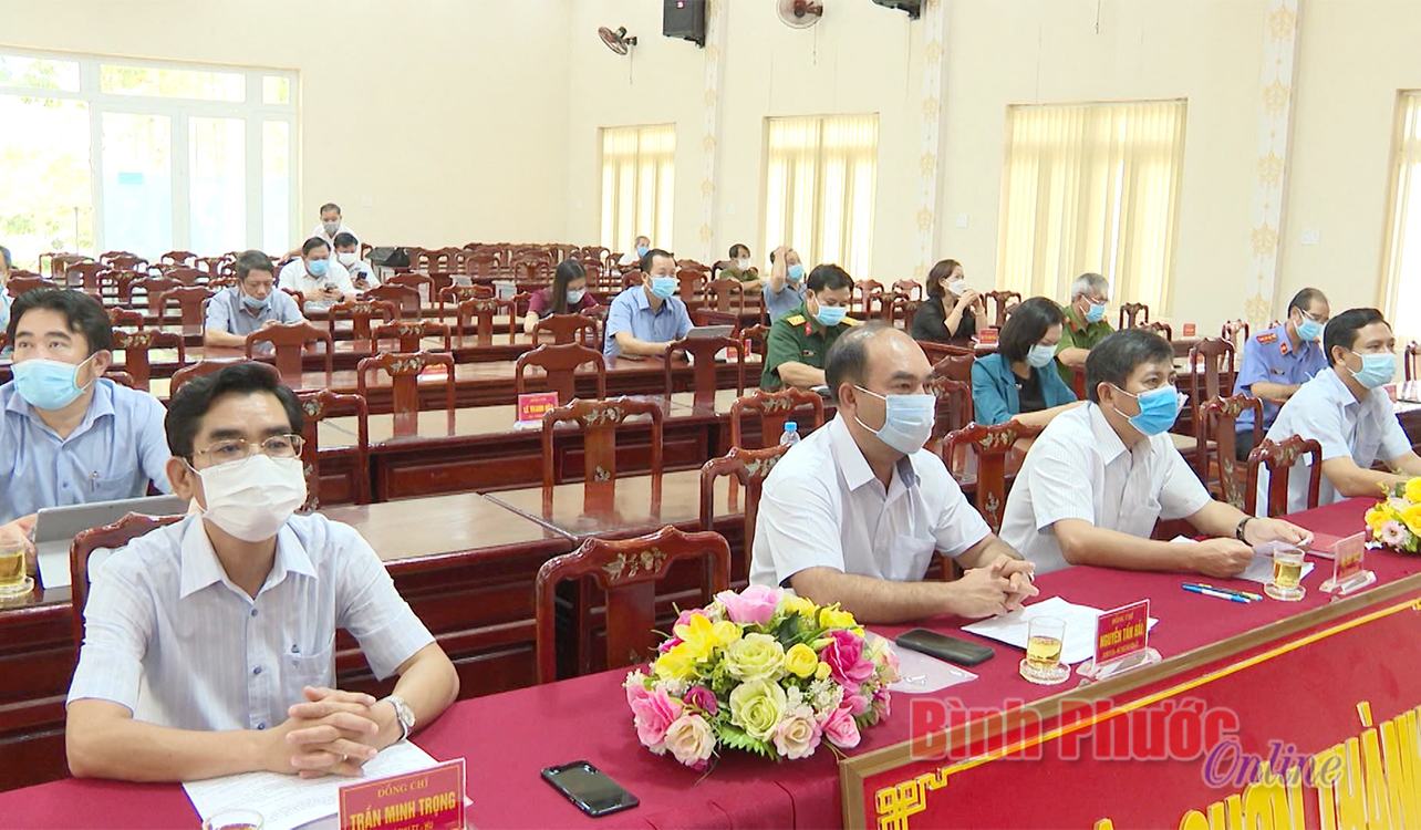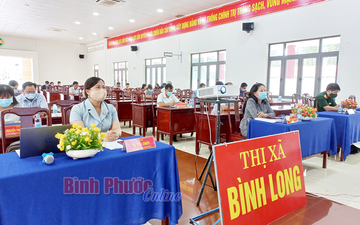 Thực hiện phòng, chống dịch Covid-19, mỗi điểm cầu tham dự hội nghị trực tuyến trên địa bàn thị xã Bình Long đều được sắp xếp tham dự dưới 50 người và tuân thủ đầy đủ quy định phòng, chống dịch.