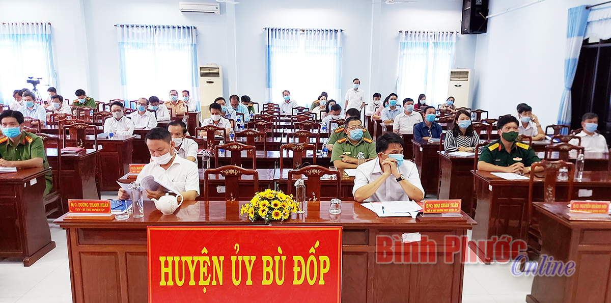 Cũng trong sáng nay, tại huyện Bù Đốp, hội nghị trực tuyến cũng được tổ chức tại 8 điểm cầu. Trong đó, 1 điểm cầu đặt tại Huyện ủy và 7 điểm tại các xã, thị trấn trong huyện. Tại các điểm cầu, các đại biểu đã thực hiện nghiêm công tác phòng, chống dịch Covid-19.