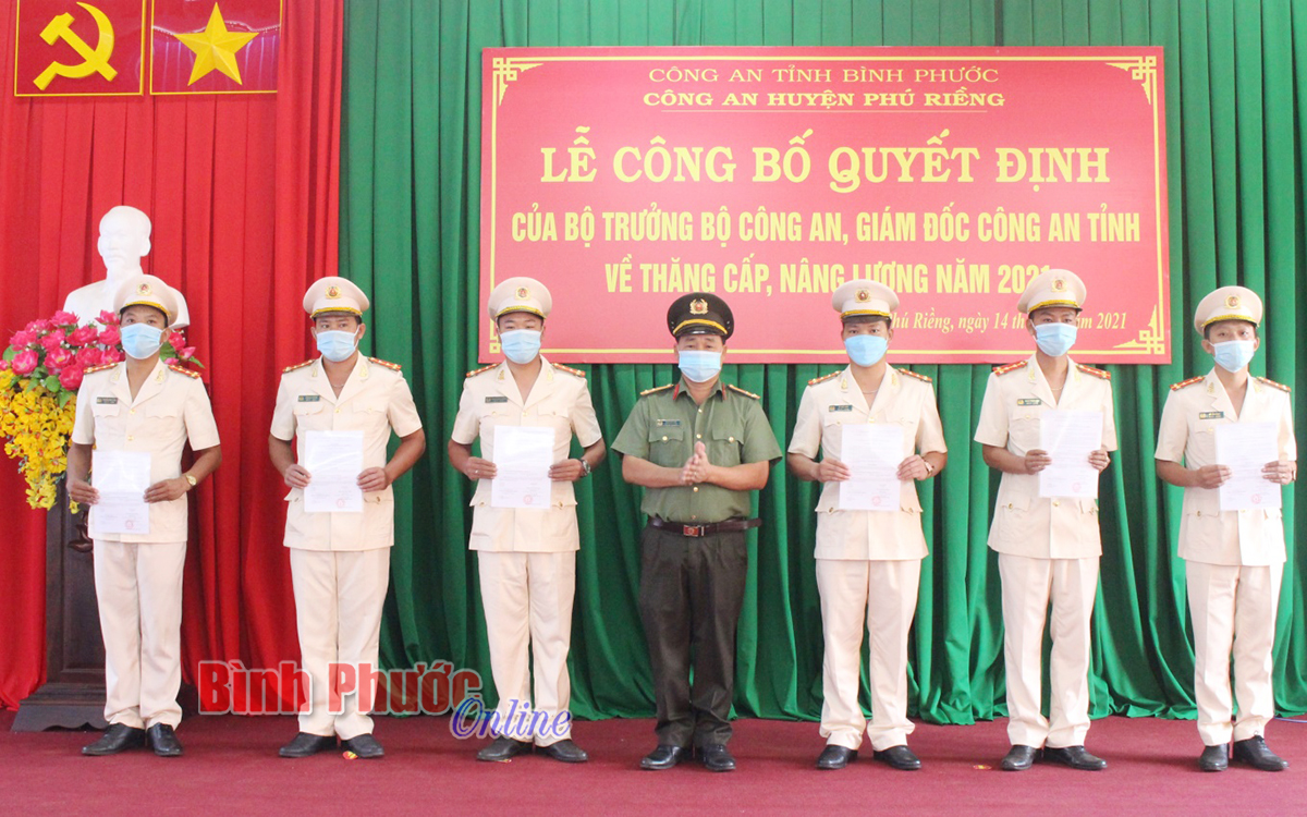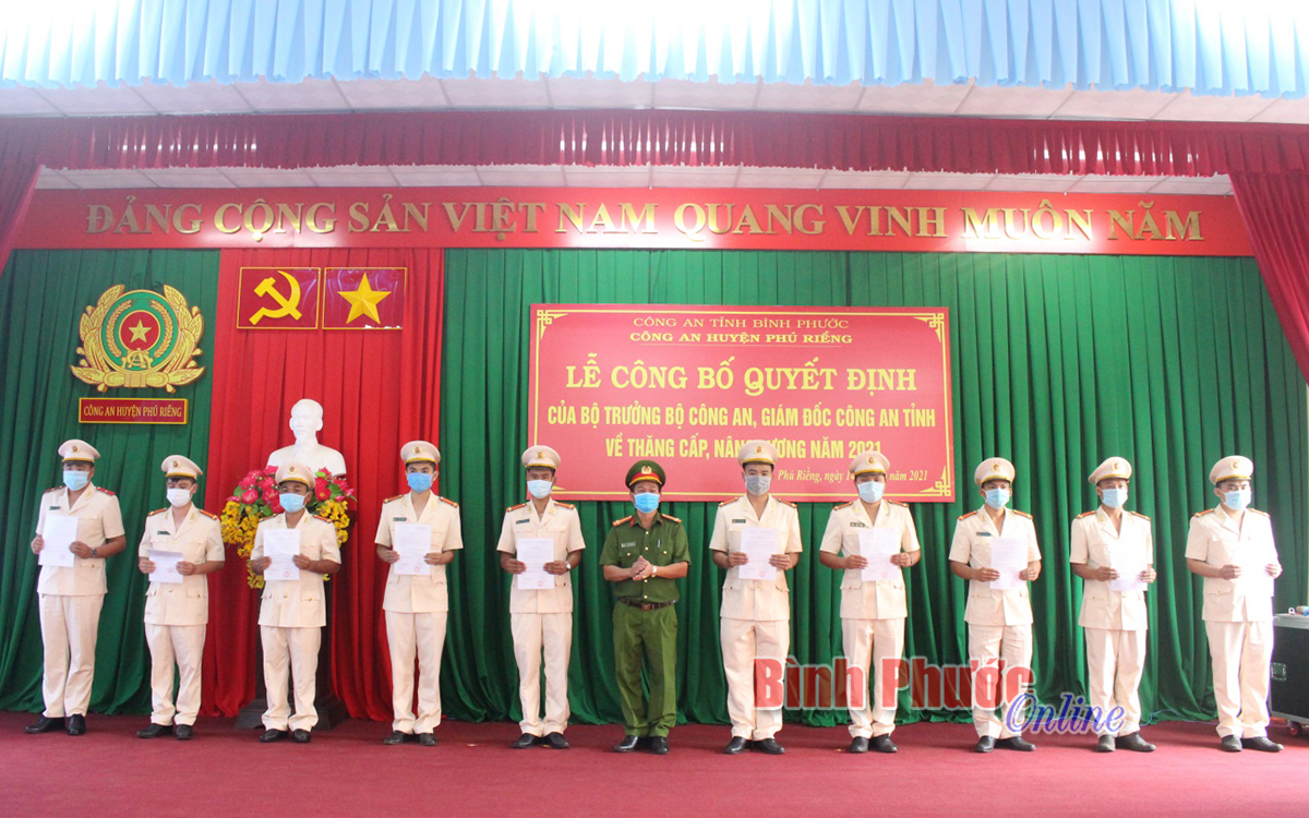 Trong niên hạn năm 2021, Công an huyện Phú Riềng có 45 cán bộ, chiến sĩ được thăng cấp bậc hàm, nâng bậc lương. Theo phân cấp, có 12 người do Bộ Công an ký quyết định từ trung tá trở lên, đã được Giám đốc Công an tỉnh trao quyết định vào ngày 1-6-2021 vừa qua; 33 người diện Giám đốc Công an tỉnh ký quyết định thăng cấp bậc hàm, nâng bậc lương sĩ quan nghiệp vụ. Trong đó, nâng lương hàm trung tá cho 1 người; thăng cấp bậc hàm từ thiếu tá lên trung tá 3 người, từ đại úy lên thiếu tá 8 người, từ thượng úy lên đại úy 12 người; từ trung úy lên thượng úy 10 người; từ thiếu úy lên trung úy 9 người; từ thượng sĩ lên thiếu úy 1 người và nâng lương hàm đại úy cho 1 người.