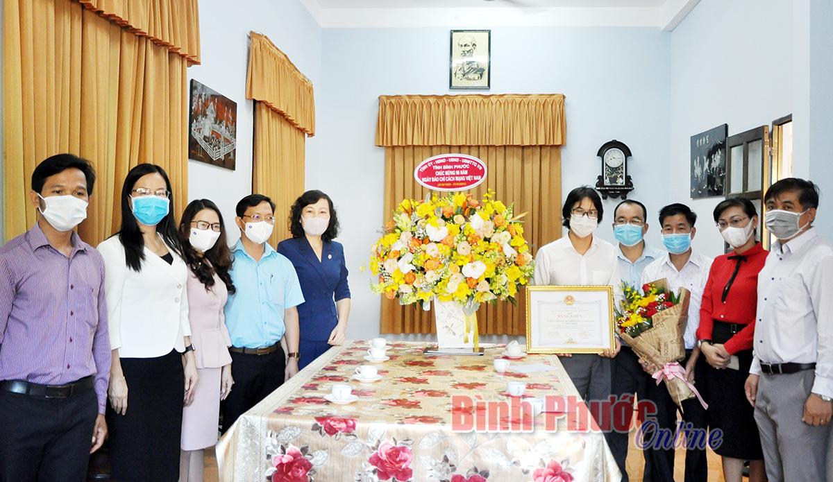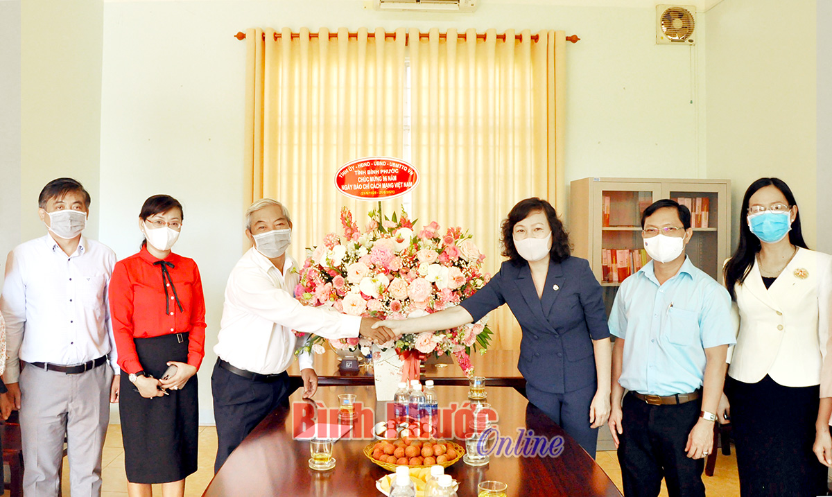 Phó bí thư Thường trực Tỉnh ủy Huỳnh Thị Hằng cùng đoàn công tác thăm và tặng hoa chúc mừng Cơ quan thường trú Thông tấn xã Việt Nam tại Bình Phước