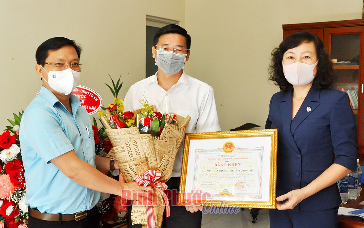 Phó bí thư Thường trực Tỉnh ủy Huỳnh Thị Hằng và Trưởng ban Tuyên giáo Tỉnh ủy Hà Anh Dũng trao tặng bằng khen của Chủ tịch UBND tỉnh cho Văn phòng Thường trú Báo Nhân dân tại Bình Phước vì đã có thành tích xuất sắc trong công tác tuyên truyền cuộc bầu cử đại biểu Quốc hội khóa XV và HĐND các cấp nhiệm kỳ 2021-2026