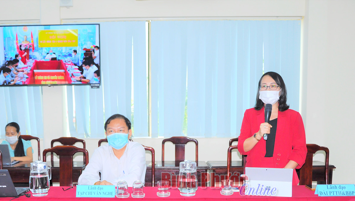 Tỉnh ủy viên, Giám đốc - Tổng Biên tập Đài Phát thanh - Truyền hình và Báo Bình Phước Nguyễn Thị Minh Nhâm chia sẻ kinh nghiệm nâng cao hiệu quả công tác tuyên truyền Covid-19 trên các hạ tầng số của BPTV. Ảnh: Như Nam