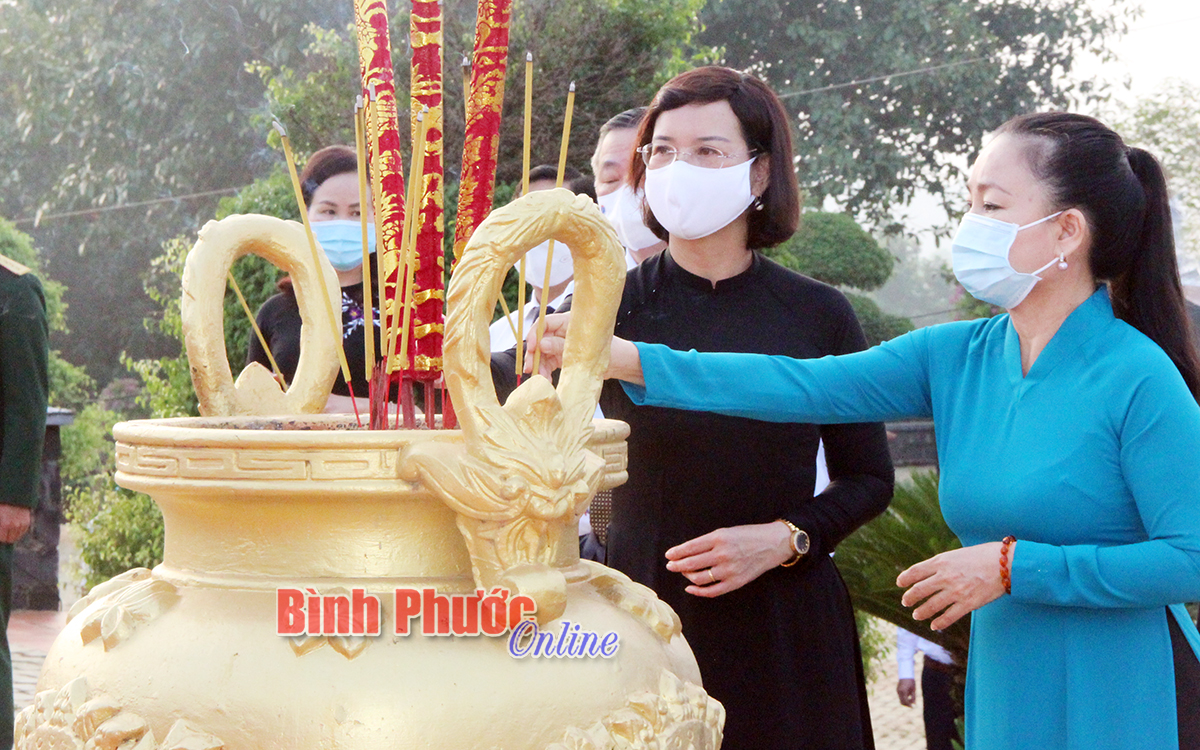 Các Ủy viên Ban thường vụ Tỉnh ủy: Lê Thị Xuân Trang, Trưởng ban Dân vận Tỉnh ủy, Chủ tịch UBMTTQ Việt Nam tỉnh; Trần Tuyết Minh, Phó chủ tịch UBND tỉnh thắp hương viếng anh linh các anh hùng liệt sĩ